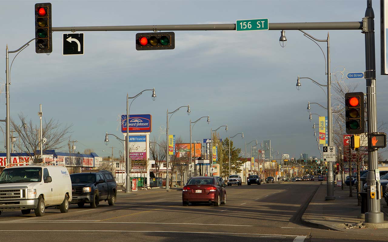 In the background: Tic-Toc Toggeries (15560 Stony Plain Road); Jasper Place Village Office, a beauty parlor; CAC Barber Shop, and Clock Auto Court at 15540 Stony Plain Road;