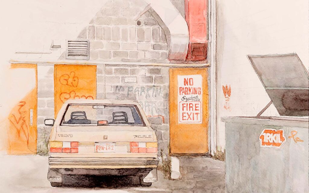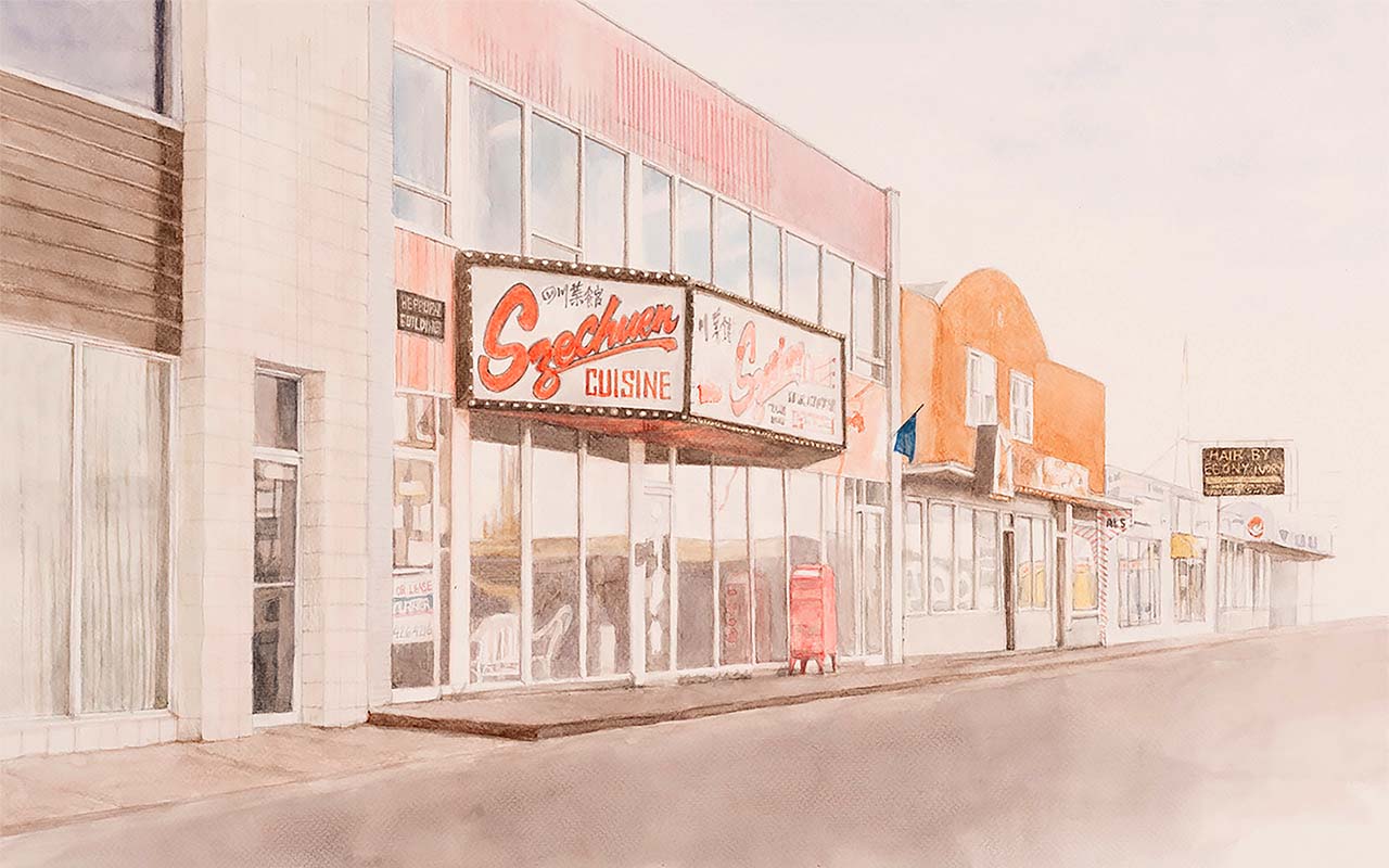 Edith Chu’s careful rendering in watercolor captures the red-lit facade of Szechuen Cuisine. Artwork by Edith Chu