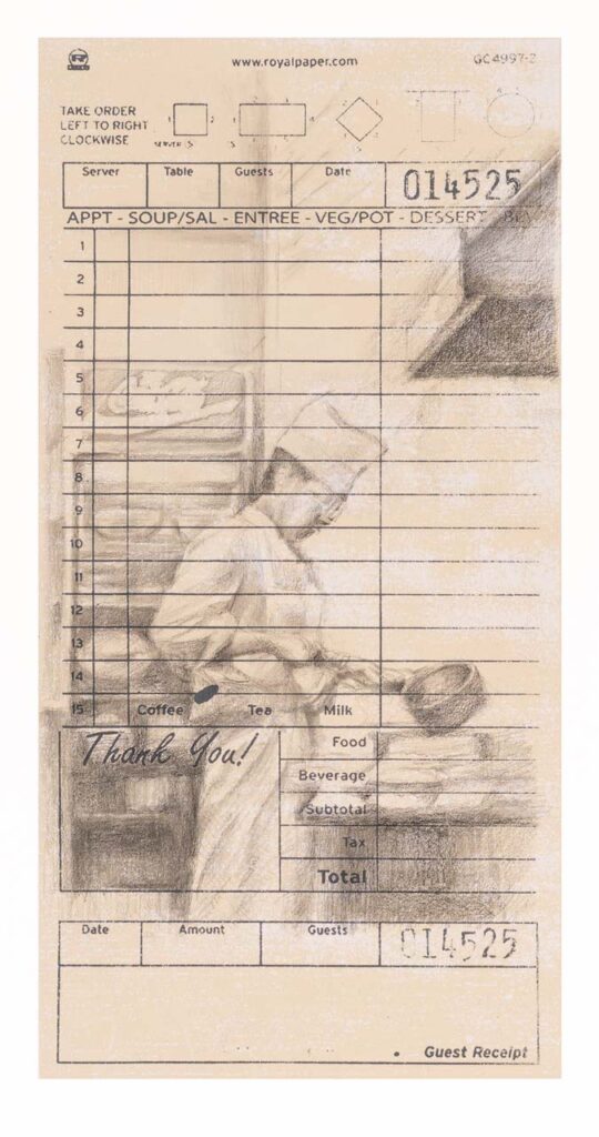 One of her pieces—a sketch drawn directly onto an old restaurant guest check—captures her father in the kitchen mid-motion, ladle in hand. The drawing, rendered in pencil on the textured surface of the receipt, echoes the everyday labor that sustained the family.