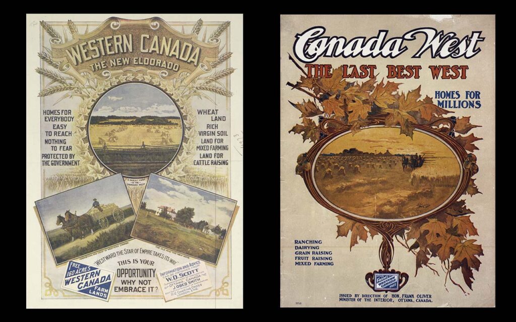 Canada’s Department of the Interior, and the Canadian Pacific Railway sought to attract white, male settlers to farm the Prairie West, preferably from Great Britain and the United States from the late 19th century to the 1920s. Colourful, enticing posters depicted the West as a land of idyllic plenty where land was free. They conveyed the image that the land was empty before settlers arrived, not mentioning or depicting Indigenous Peoples, or indicating that treaties with First Nations promised that the land and resources were to be shared.