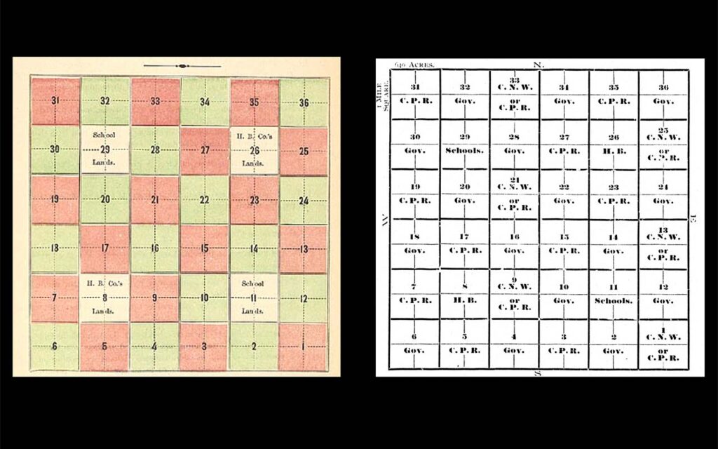 Right: Drawing of a Township, Canadian Pacific Railway. Land map of Manitoba and Canadian North West. [Montreal- CPR], 1899, via Archive.org.